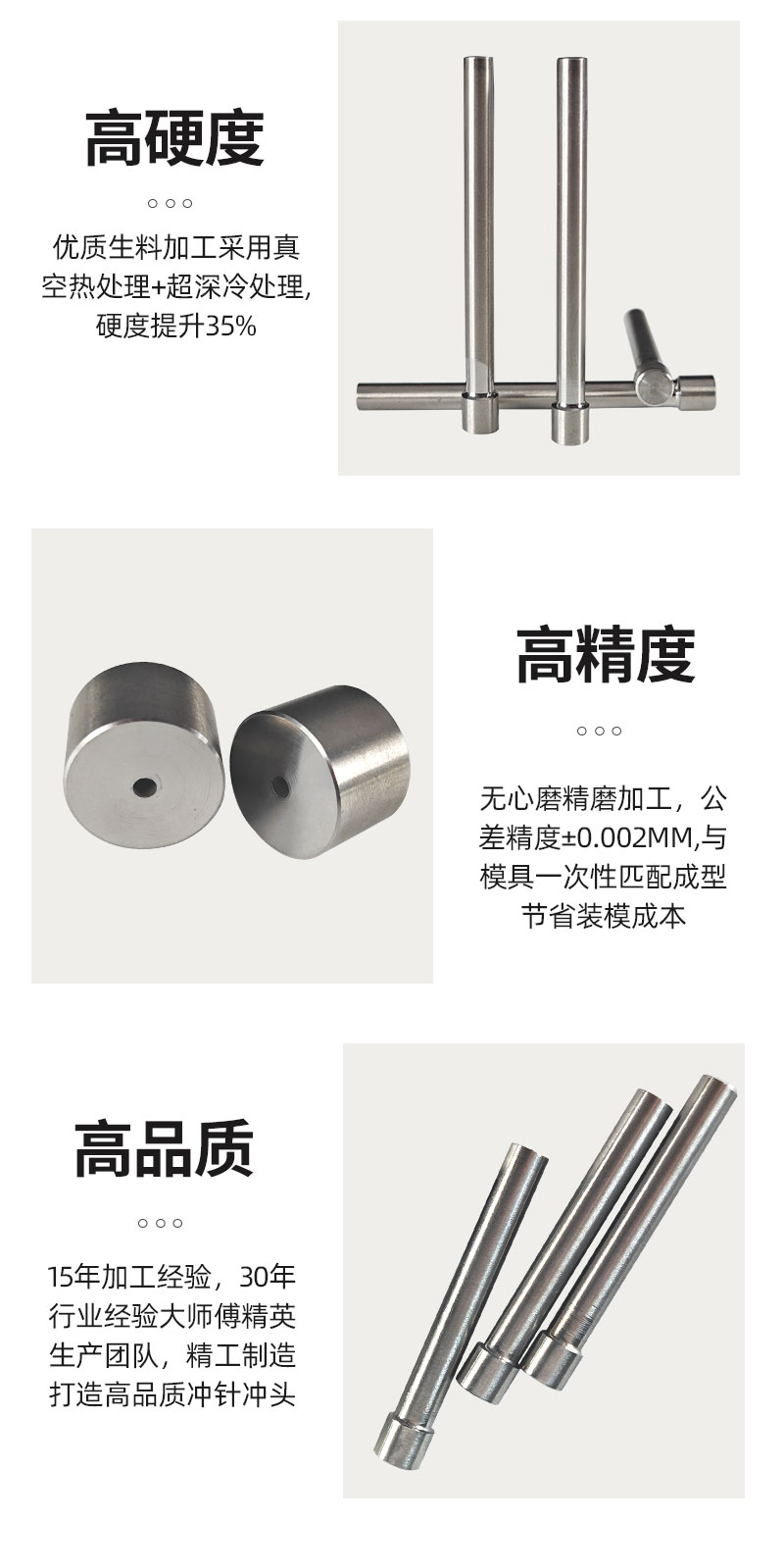 硬質合金沖針以高品質碳化鎢為主要原料,憑借其出色的耐磨性能與良好的抗彎強度,為產品性能奠定基礎。在生產工藝上:?